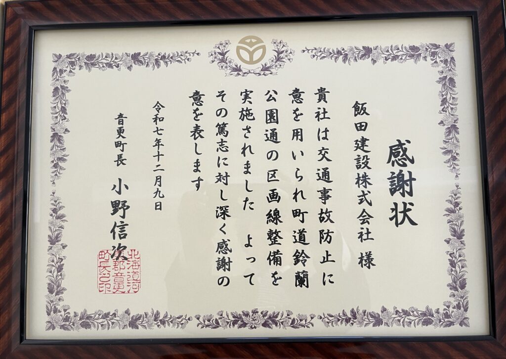 帯広浦幌線交通安全(通学路)工事(桜田橋)の活動で音更町より感謝状を授受いたしました。news