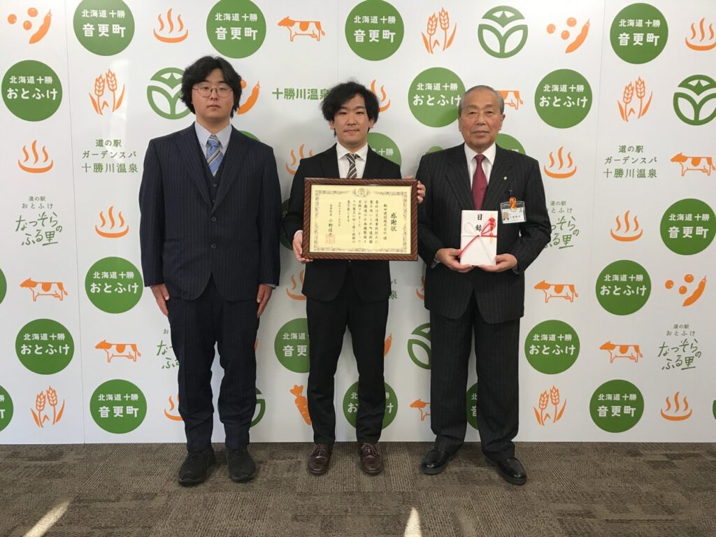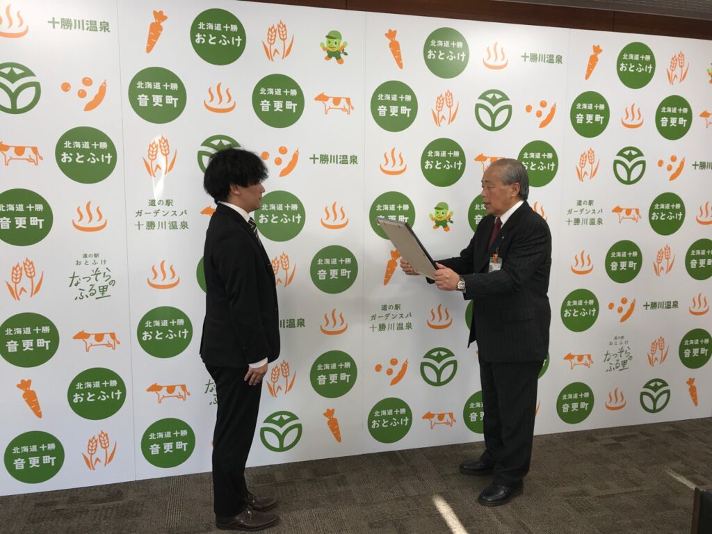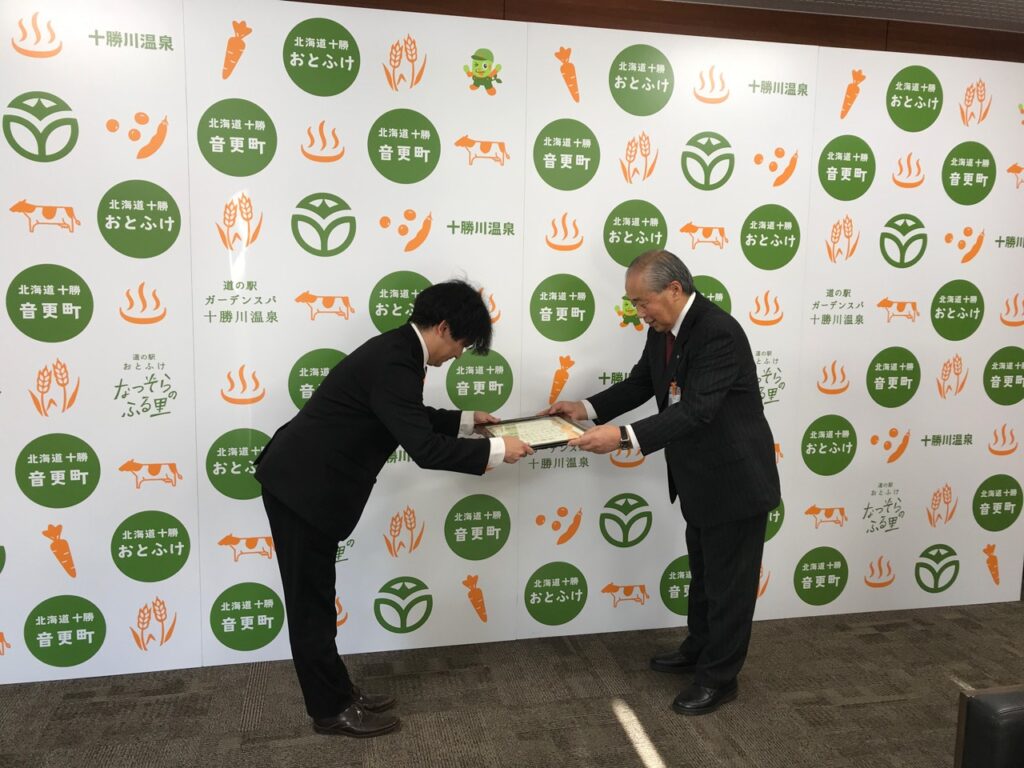 12月9日(火)に音更町役場にて感謝状の贈呈式が行われ、小野信次町長から感謝状を授受いたしました。